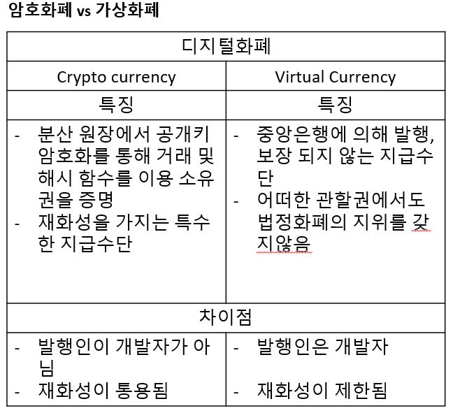 아래 표는 제가 간략히 암호화폐와 가상화폐라는 2가지 개념에 대한 특징과 차이점에 대해 정리를 한 것인데요.