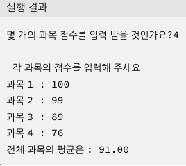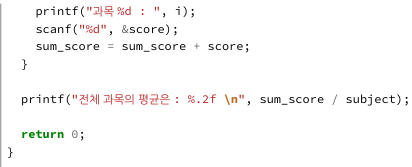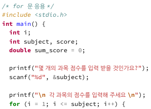 이후 각 과목 점수를 입력하기 위해, i의 초기값은 1이고, i가 subject 수보다 적거나 같을때까지 1씩 증감시키며 for문을 수행한다. figure.9를 보니 과목은 4개니까 4번 for문이 수행 되었음을 알 수 있습니다. 그리고 각 과목에 점수를 순서대로 입력하면, score 값이 대입이 되고, 그 값은 sum_score에 대입된다. 그리고 다시 for문 반복시 새로운 score 값이 대입되고 아까 과정을 반복합니다. 마지막으로 4개의 과목에 총 점수를 나누어 평균값을 구하여 출력합니다.