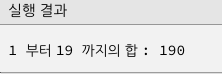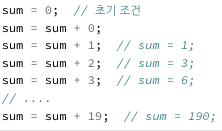 중요한 부분은 sum = sum + i;라는 코드이다. sum이라는 변수의 i의값이 계속 더해지는 구조이다. 즉 sum에 sum+i값이 대입 되는 것이다. 그래서 sum에 0부터 19까지의 값이 더해지는 것이다. 이를 수식으로 풀어보면 figure.6과 같다.