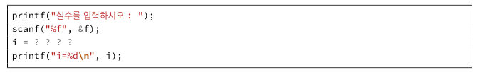 임의의 실수에서 소수점 이하 두자리수만 추출하여 정수형 변수에 대입해봐라! 예를들어 사용자로부터 입력받은 실수 f 가 12.3456이라면 34만 추출한다. 이때 반올림은 고려하지 않아도 상관없다. f 가 달러 단위의 화폐 액수라고할 때 센트 단위만 추출해내는 경우라고 생각하면 된다. 다음 ???? 자리에 적합한 연산식을 작성하는 문제이다.