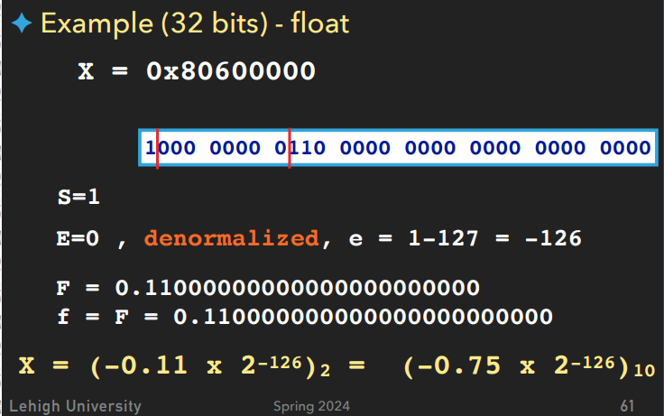 이제 IEEE 754 방식의 예시를 살펴볼게요. 예를 들어, 0x80600000이라는 32비트 부동 소수점 수를 생각해보세요. 이 값을 이진수로 변환하면 S(부호) = 1, E(지수) = 0(비정상 수), F(가수) = 0.110...으로 나타낼 수 있어요. 이 값을 계산하면 (-0.11 x 2^-126)이라는 결과를 얻을 수 있죠.( 너무 어렵다. 이제 그만 넘어가겠습니다)