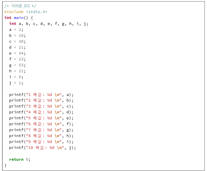 배열은 이처럼 동일한 데이터 타입의 여러 원소들을 표현하는데 코드를 쉽고 깔끔하게 작성하기 좋습니다. 반대로 배열을 사용치 않고, 동일한 결과를 내야한다면 어떻게 해야할까요?