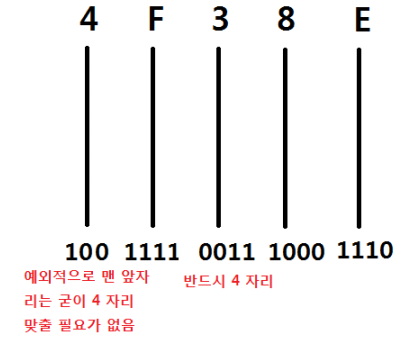 또 16진수를 이진수로 그리고 이진수를 16진수로 변환할 시에는 16진수의 각 자릿수를 4자리 이진수로 변환해 주면 된다.