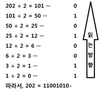 figure.4처럼 자릿수가 하나 올라갈 때마다 그 자릿수의 값이 2배로 된다는 사실만을 기억하면 됩니다. 자 과연 어떻게 십진수를 이진수로 바꿀까요? figure.5를 봅시다. 매번 2로 나누고 나머지를 뒤에 적습니다. 그리고 몫이 0이 될 때까지 나눕니다.