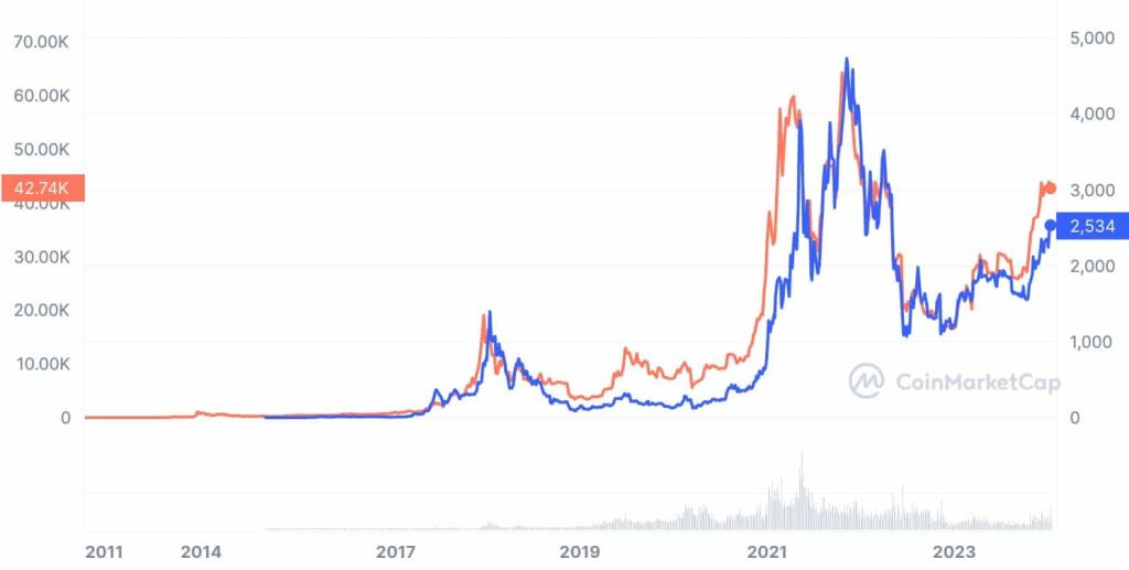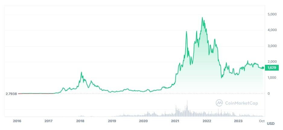 이더리움의 가격 차트를 보면, 2021년에는 4,000달러를 넘는 가격을 기록했지만, 현재는 다소 하락세를 보이고 있죠.