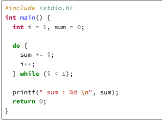 figure.4를 보면 i값이 1이기 때문에 일반적인 for,while문은 실행이 안되고 sum의 값이 0으로 출력이 되어야 하지만, do-while문은 do문이 먼저 실행이 되고 while문이 실행이 되기 때문에 do에서 sum += i;를 통해서 sum에 i값이 대입이 되어서 sum값이 1로 출력이 되는 것입니다. 간단하죠?(흠... 보시는 분들이라도 이해가 되셨길...)