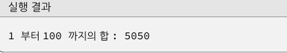 위 경우 i의 값을 계속 검사하여 100 이하인지 확인하고, sum에다가 i를 더하고 i의 값을 증가 시키고,. 이 과정을 반복합니다.