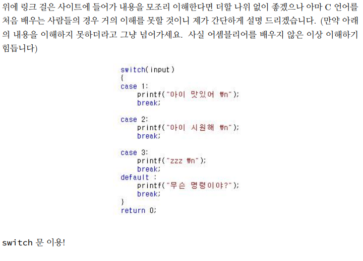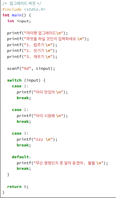 그런데 만약 강아지가 10가 이상의 명령에 반응하게 하고싶다면 기존에 우리가 배운 데 까지라면 if문과 else if문을 계속해서 쓰면서 해야할 것 입니다. 그렇게되면 코드가 굉장히 길어지고, 보기도 지저분해서 안개발자스러울 것입니다.
