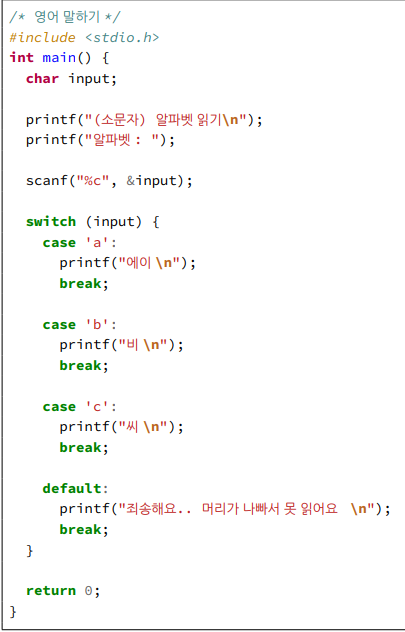 그리고 switch문의 default는 if문의 else와 같은 역할을 합니다. 즉 이것도 아니고 저것도 아닌 것들이 오는 case인 것이죠.